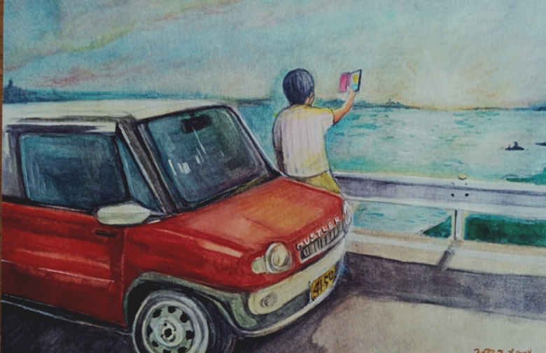 まず水彩から始めました。あまり絵具を使い慣れてない時期にも関わらず、思うがまま1枚描いてみようと思い立ちました。そして思い浮かんだのは 自分がそのとき乗っていた愛車 (スズキのハスラー)で、関西をドライブ旅行したい、というものでした。思い切って描いてみたら 下の絵のようになりました。